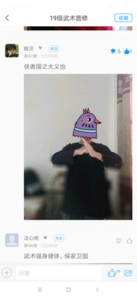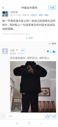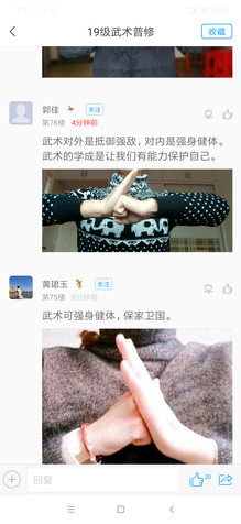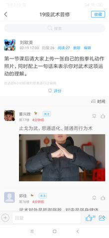在第一次QQ直播中19级课程时,老师利用QQ群跟大家在线直播,在直播过程中,通过设计问题互动回答,老师提出问题,2班3班的同学以文字形式在讨论区写出自己的答案,随机抽取1班同学的学号,点击连麦,以连麦方式跟老师现场互动。在讲解抱拳礼、基本手型、拳法、基本步型时,通过连麦现场视频的方式,来检验现场学习效果,让其他同学指出动作错误的地方,让其引以为鉴,也更直接形象的看出来动作的易犯错误。课后大家通过学习通和其他平台完成线上作业,在讨论中学生们的课后参与较高以这样的模式检测直播后的学习情况,线上直播效果初见成效。
