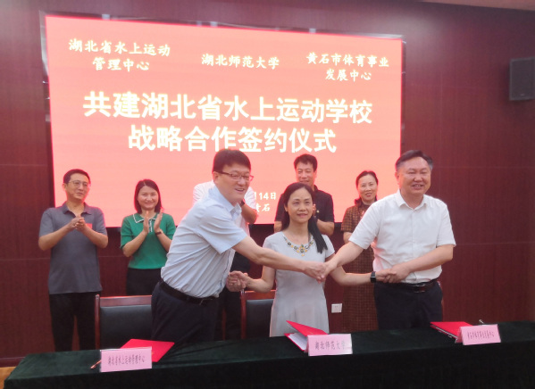 沈浩、王赛玉、戴圣平分别代表湖北省水上运动管理中心、正妹av 、黄石市体育事业发展中心三方共建单位签订了《共建湖北省水上运动学校战略合作框架协议》。