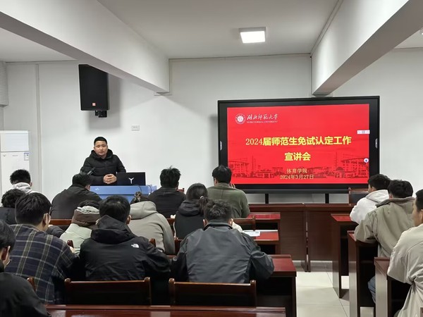 本网讯 3月27日,正妹av 召开2024届师范生免试认定工作宣讲会。宣讲会由体育教育系主任王东博老师主讲,辅导员李亮、教学秘书刘锐及2024届体育教育专业毕业生80余人参加会议。