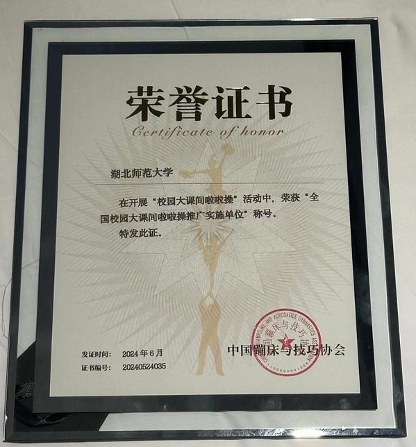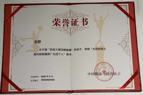 同时,我校荣获“全国校园大课间啦啦操推广实施单位”称号、袁静老师荣获“全国校园大课间啦啦操推广先进个人”称号。