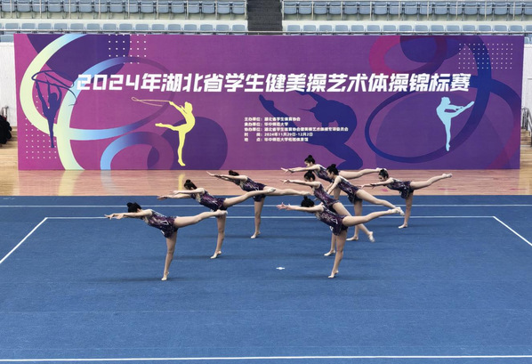 本次比赛由湖北省学生体育协会主办,华中师范大学承办,湖北省学生体育协会健美操艺术体操专项委员会协办,比赛分为大学组、中小学组,来自全省的100支队伍1746名运动健儿参赛。我校队伍凭借着精心设计且高水准的编排,无论是个人项目还是集体项目,运动员以扎实深厚的功底以及灵动且富有感染力的表现,展现了身体与器械的完美结合,呈现出了超凡的技艺水准。