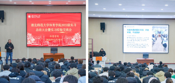 实习成果交流阶段,各小组举办了专题汇报会。学生们结合自身实习方向,分享了在中小学课堂教学与课后体育服务、商业健身机构运营、社区健康促进等领域的实践收获与反思。指导老师结合行业发展趋势进行点评,现场互动热烈,体现了专业发展的多元路径与活力。曾在中小学完成体育支教实习的2205班熊丁蕾同学,在12月18日召开的《正妹av 2022级实习总结大会暨“千师百校”体育支教经验交流会》上分享到:“这段经历让我完成了从‘体育生’到‘教育者’的蜕变。”这段简洁而深刻的感悟,恰是专业能力向基础教育领域成功迁移的生动写照,也折射出本专业学生通过实践锤炼,获得的角色转换与综合素养提升。